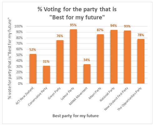 All of these parties appear to have more underlying support than party vote support; the percentage of those who think they are the party that is best for their future and intend to cast their party vote for that party is less than 80% and, in the case of the Conservative Party and MANA Movement, less than 35%.