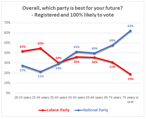 The two main parties are not completely immune from this: with those who think National is the best party for their future, 2% intend to vote for the Labour Party, 2% for New Zealand First, 1% for ACT New Zealand and 1% for the Green Party. For those who think Labour is the best party for their future, 1% intend to vote for National, 1% for New Zealand First and 2% for the Green Party.