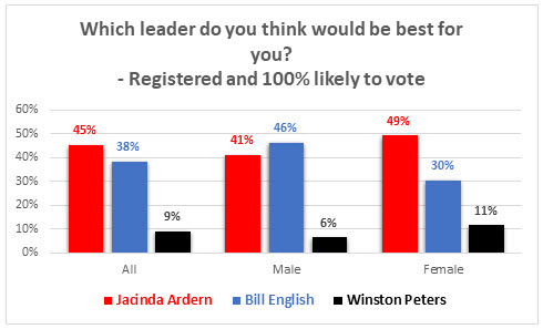 When asked “which party leader do you think will be best for you?” Labour leader Jacinda Ardern scores 48%, National Leader Bill English 35% and New Zealand First leader Winston Peters 9%.