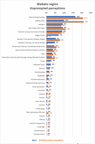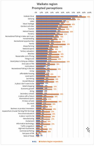 Unprompted, the one thousand participants were most likely to associate the Waikato with dairy or farming in general (16%), the Waikato river (10%) and Hamilton (8%). When prompted, 79% of New Zealanders are likely to associate Waikato with the river, and 66% with dairying.