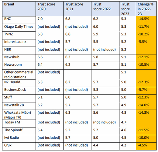 In 2023, all the major New Zealand news brands suffered a considerable decline in trust. Trust in RNZ fell 14.5%, Whakaata Māori 14.3% and Newstalk ZB 14%.Smaller brands such as interest.co.nz, BusinessDesk and Crux were less impacted.
