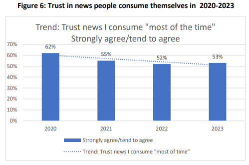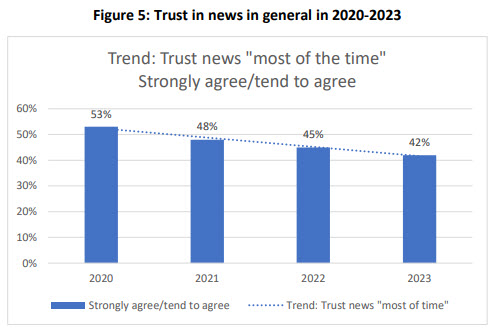 In 2023, general trust in news declined from 45% to 42%, continuing a downward trend that was already evident in 2020 when the survey was first conducted. However, in 2023, the trust in news people consume themselves increased from 52% to 53%.